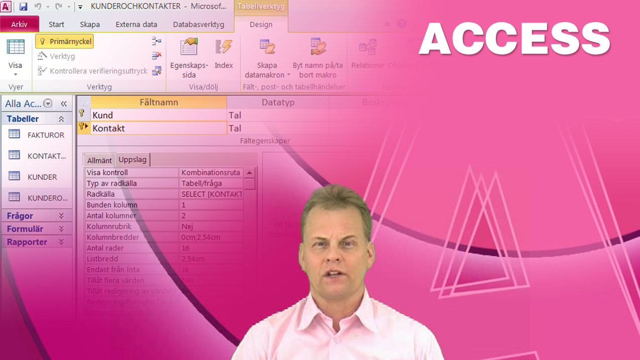 Databasprogrammet Access 2010 är ett mycket kraftfullt program som du kan använda för att skapa mängder av oliak databaslösningar med. Syftet med kursen om Access 2010 är att du får kunskaper som du behöver för att bygga en smart lösning till dig eller till dina kunder som passar verksamheten som ni jobbar med. I första delen av denna nätkurs i Klickportalen K3 lär du dig hur Access 2010 fungerar från grunden med strukturen av hur tabeller, frågor och formulär samverkar.