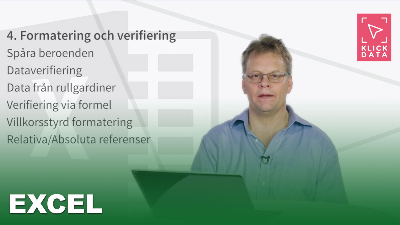 Ibland kan det vara svårt att kontrollera hur formler förhåller sig till varandra eller att kunna hitta källan till ett fel så i kapitel 4 ska vi titta på formatering och verifiering. Vi ska se spårning för att se hur vilka celler som påverkar vilka. Vi ska se på på Villkorsstyrd formatering som markerar automatiskt viktig information i ett kalkylblad. Vi ska även verifiera data, vikan använda dataverifiering för att begränsa typen av data eller värden som användaren anger i celler. Vi ska även se på relativa och absoluta referenser.